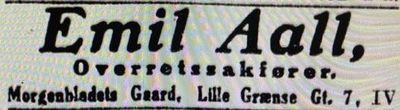 | Han fortsatte til sin dødsdag sin sakførervirksomhet i Oslo, som han efterhånden opparbeidet til en betydelig og solid forretning. Hans orden, pålitelighet og samvittighetsfullhet skapte ham tillit og anseelse i vide kretser. Hans uventede bortgang brakte sorg også utenfor hans nærmeste krets, savnet som han ble både av venner og klienter. Emil Aall var det selvskrevne midtpunkt innen vennekretsen. Til ham kom de alle med sine bekymringer, og her var det alltid trøst eller et godt råd å få. | ||