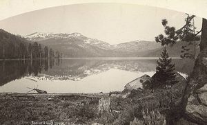 Øverst paa ’’Summit’’ var Temperaturen falden ned til 45 Fahrenheit (ca 7 grader Celsius). Her var det vildt, vildt og dog skjønt tillige. Nogen Beskrivelse er jeg ei mægtig til at give. Scenen vexler uafbrudt; Sneskuur, Tunneler og lidt problematisk udseende Broer drager man igjennem og over Milelangt paa Sjerra Nevadas Skraaninger et Par 1000 Fod over Dalbunden. Et eneste uafbrudt Sneeskuur er 5 norske Mile langt. Dybt, dybt nede sees den nydelige, men sørgelig bekjendte ’’Donner Lake’’. En Snestorm overfaldt her, før Jernbanen kom istand, Familien Donner og begrov den. Saa kommer ‘‘the devils slide’’ og’’the devils gate’’, - og saa den vilde, dybe ’’Echo Cannon’’ og ’’Weber Cannon’’, med dens røde, høie Sandstensvægge, der tildeels hænge udover Banelinjen, - saa Smaabyer, opfyldte af Guldgravere; hele Egnen er oprodet og gjennemledet paa kryds og –tvers af Vandcanaler for Guldvadskningens Skyld.