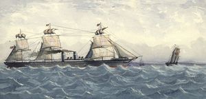 "City of Richmond" var et i enhver Henseende vel udrustet Skib (se bildet), - 2580 Tons, - 425 Fod (ca 126 meter) langt og 45 (ca 13,5 meter) bredt; Vi vare 1100 Mennesker ombord, af hvilke omtrent 100 Cabin passengers (passasjerer med lugar). Vi havde det rummeligt og godt. Men the Steerage passengers (tredje klasse passasjerer) havde det vist nok ikke altfor godt; de stode pakkede sammen, naar de vare oppe paa deres Dæk. Livet ombord paa et saadant Skib er naturligviis i Længden temmelig kjedeligt. Naar jeg undtager et Døgn, hvori der blæste en frisk Vind, saa Skibet, der førte en heel Deel Segl, krængede og duvede dygtigt og Bølgene slog over selv det høie Hurricandæk, var Veir og Vind den hele Tid smukt og favorabelt. Alligevel var en heel Deel søsyge, - baade Damer og Herrer. Selv gik jeg ganske fri.