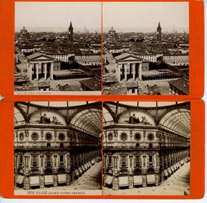 Det ovennævnte Galleria Vittorio Emanuele II er en med Glastag overhvælvet Passage eller rettere 4 Passager, der støde sammen i en uhyre stor Dome eller Kuppel; den er mere end 500 Fod lang (ca 150 meter), 42 Fod. bred og 80 Fod høi, - i Kuppelen 150 Fod høi; den er prydet med 24 Statuer af berømte Italienere og oplyses om Aftnerne med 2000 Gasflammer; det skal være Europas skjønneste og mest storargede Galleri, og selv Paris, der har en heel Deel saadanne Passager, har dog ingen, der kan komme ved Siden af denne, - saa sige de, der have været i Paris. Denne Passage forbinder Domepladsen og Domen med Theatret ’’della Scala’’, (der er Europas største Theater næst ’’San Carlo’’ i Neapel) og Pladsen af dette Navn; paa denne store beplantede Plads staar et Monument for Leonardo da Vinci; det er et Standbillede paa en Sokkel af cararisk Marmor, ved hvis 4 Hjørner ere 4 Statuer af Mesterens Disciple og paa hvis 4 Sider ere Relieffer af hans Hovedværker. Det Hele er saaledes et skjønt Ensemble, vel værd at se.