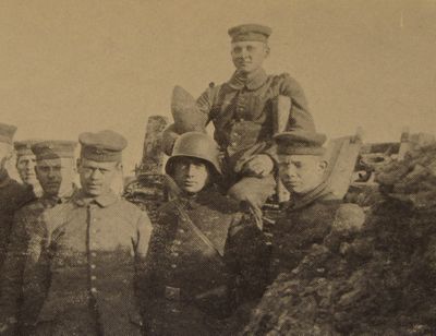 Ernst Aberle (helt til høyre) fotografert i en skyttergrav under første verdenskrig i dagens Latvia i 1917.