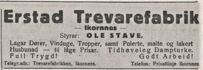 Erstad var borte frå Sykkylven i seks år frå 1924. Den tida var han m.a. disponent for Stjørdal Møbel & Trevarefabrikk, og han var engasjert i trelasteksport til England. Frå 1924 til 1930 var Erstad Trevarefabrikk leigd ut til brørne Bernt og Ole Stave, som hadde vore ved verksemda i mange år. Dei heldt fram med det same produktutvalet som Erstad Trevarefabrikk hadde slått inn på tidlegare. Namnet på bedrifta vart heller ikkje endra.