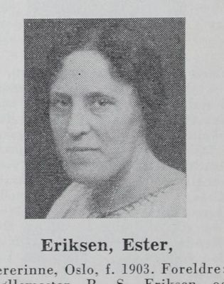 Ester Olefine Eriksen, (født 13. februar 1903 i Høland, død 13. januar 1978 i Oslo) ble student i 1923 og cand. mag. i 1946. Eriksen var først guvernante og vikar i hjembygda fram til hun ble ansatt i osloskolen i 1934. Hun virket som øvingslærer ved Oslo offentlige lærerskole og var lærebokforfatter. I flere år var hun nestleder i Østlandsk lærerstemnes styre.