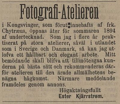 Hun slo seg ned i Danmark, hvor hun ca. 1896 overtok Emil Tromholts atelier i Svendborg, kom senere til Rudkøbing. Fra 1894 og igjen omkring 1905 var hun aktiv i Kongsvinger. Folketellingen 1906 i Rudkøbing, har 16.07.1869 oppgitt som fødselsdato og hun har signert Ester Kærstrøm. Etternavnet og annonser viser at hun var svensk. Bonge oppgir at hun var født i 1878, men utifra annonsen i 1894 og andre opplysninger må hun være eldre.