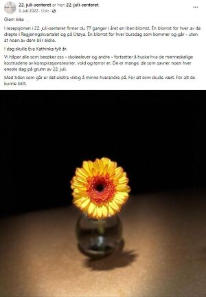 I resepsjonen i 22. juli-senteret finner du 77 ganger i året en liten blomst. Én blomst for hver av de drepte i Regjeringskvartalet og på Utøya. Én blomst for hver bursdag som kommer og går - uten at noen av dem blir eldre. I dag skulle Eva Kathinka fylt år. Vi håper alle som besøker oss - skoleelever og andre - fortsetter å huske hva de menneskelige kostnadene av konspirasjonsteorier, vold og terror er. De er mange, de som savner noen hver eneste dag på grunn av 22. juli. Med tiden som går er det ekstra viktig å minne hverandre på. For alt som skulle vært. For alt de kunne blitt.[3] | ||