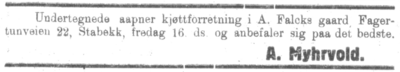 Høsten 1927 ble det meldt om to nye forretninger på samme adresse. Agnes Falck meldte «at hun agter at drive kolonialforretning i Fagertunveien 22 under firmanavn A. Falck», mens Ingeborg Ørbeck skulle drive delikatesse- og kjøttforretning. Allerede i 1928 var A Myhrvold på plass som ny driver av kjøttforretning.
