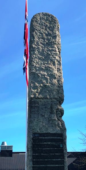 Minnesmerke utenfor Lillestrøm kirke til minne om falne under andre verdenskrig fra Lillestrøm, avduket 17. mai 1947. Minnesmerket er utført av Trygve Dammen. Foto: Stig Rune Pedersen.