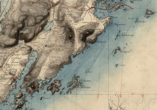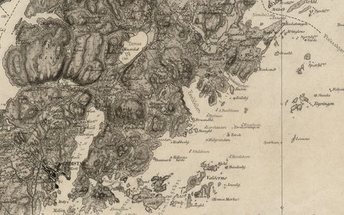 Dette kartet har mange av opplysningene som vi også finner i 1850-utgaven. Men kanskje er dette noe mer rettet mot sjøfarende, for her er merket og navnsatt svært mange grunner og skjær. Skrivemmåten - og skrivefeilene? - fra 1850 henger fortsatt med.
