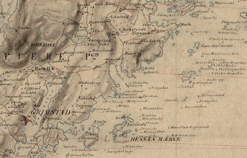 På dette kartet finner vi den gamle kongeveien, forbi Landvik kirke og Fjære kirke og videre mot Nidelva ved Sandstø. Selv om Grimstad ikke har fått bystatus, er det risset inn noe som kan forstås som havn og bebyggelse ved Grømstad. Innen Fjære finner vi stedsnavnene Grømstad, Fiere, Nodenes, Haabestad, Lien, Kionnestad, Hesnæs, Espenes og HesnæsØen. Innerst i Vikkilen ligger en varde/vete.