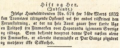 "Efter kgl. resol. af 17. august 1830 skulde posten gaa fra Nordlands postkontor hveranden uge til Bodø, fordi denne kjøbstad ikke som de andre kjøbstæder nordenfor kunde benytte den saakaldte fjeldpost over Haparanda."[1]