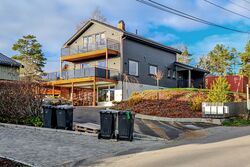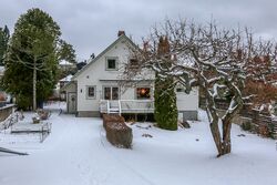 «Haukefjeld»; villa fra mellomkrigstiden som rundt 1980 ble påbygd fra enebolig til tomannsbolig.
