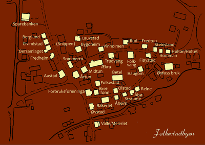 Eigedomen Folkestad som har gjeve namn til Folkestadbyen. Huset bak til venstre er truleg fyrste bygningen i Folkestadbyen.