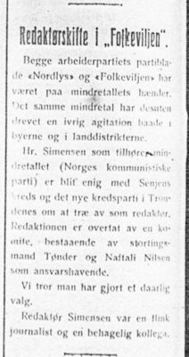 Da Arbeiderpartiet (DNA) løste på båndene til Komintern (3. Internasjonale - også kalt Den kommunistiske Internasjonale) på sitt landsmøte høsten 1923, ledet det til at Norges Kommunistiske Parti (NKP) ble stiftet. Folkeviljens redaktør, Sigurd Simensen, var blant de som valgte å stå tilsluttet Komintern. Motstanderne hans, med Tønder i spissen, fant det uakseptabelt at Simensen skulle fortsette i stillingen. Det ble dermed forsøkt vedtatt å ta fra Simensen vervet som redaktør. Simensen kunne ikke godta noen oppsigelse og fortsatte sin redaktørgjerning som om intet var skjedd. I tillegg hadde han lønn til gode, slik at det av den grunn ikke var lett å kvitte seg med ham. Det har oppstått flere myter om hva som så ledet til at Simensen fratrådte. En går ut på at en mannsterk gruppe med Peder Jacobsen (senere stortingsmann og odelstingspresident) i spissen, som nå hevdet å være bladstyrets nye formann, slo til og okkuperte avislokalene i «Arbeidersamfundet». Aksjonen ble gjennomført mens redaktør Simensen inntok sin daglige lunsj på en av byens kafeer. I lokalene befant seg kun Aage Rønning, som fortsatt regnet seg som bladstyrets formann. Det skal ha gått ganske verbalt hardt for seg, ifølge Peder Jacobsens egen forklaring til Harstad Tidende på 1960-tallet. «Okkupantene» stengte døra slik at Simensen ikke kom seg inn da han dukket opp. Han tok en titt gjennom vinduet, forsto situasjonen og forsvant fra stedet. Episoden skal ha skjedd midt i desember 1923, vel en måned etter at «nykommunistene» brøt med DNA.