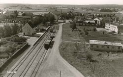 Skreiabanen ved Lena stasjon, sett fra taket på Toten kornsilo. Postkort utlånt av Knut Borg.