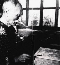 Ivar Høyvik i arbeid med treskjæring. Foto: Ukjent/Balestrand kommunes fotosamling, faksimile fra Urtegaard 1991:Balestrand bind II. Gards- og ættesoge.