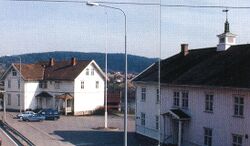 Bygningen til venstre er Fetsund skole der biblioteket holdt til i tre perioder. Til høyre det gamle herredshuset der biblioteket har sine lokaler i 2020. Privat foto.