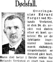 Faksimile fra Aftenposten 25. juli 1936. Utsnitt av nekrolog over Edvard Torget.