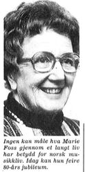 Marie Foss (født 14. februar 1907 i Vejle, Danmark, død 27. februar 1993) var musikkpedagog, fiolinist og kordirigent. Etter å ha giftet seg med en nordmann flyttet hun til Norge på slutten av 1930-tallet. I 1947 ble hun ansatt som kordirigent i NRK, hvor hun ble helt til 1985, hovedsakelig som leder for NRKs Jentekor.Marie Foss var født og oppvokst i Danmark. Hun var utdannet fra Det kongelige danske Musikkonservatorium 1924-1927 med fiolin som hovedinstrument, og en tid underviste hun ved København Drengekorps Musikskole. 1936–1938 var hun ansatt ved København Musikkonservatorium og Folkemusikkskole. Hun giftet seg med nordmannen Daniel Foss i 1933, og i 1938 flyttet hun til Norge, hvor hun hadde sitt virke resten av livet.