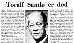 Faksimile fra Aftenposten 5. mars 1970, utsnitt av nekrolog over Toralf Sandø.