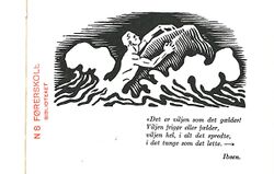 Fra propagandasjef Klevenbergs Sett og sagt : ord for tiden (1943). Boka tilhørte biblioteket på NS Førerskole på Jessheim. Etter krigen havna Klevenbergs eksemplar på Gjøvik bibliotek.