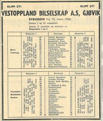 Rutetabellen til den første ringruta, gjeldende fra 15. mars 1966, trykt bl.a. i lokalavisene på Gjøvik.