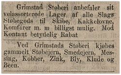 Grimstad Støberi annonserer lager av variert støpegods og kjøper jern og annet Foto: Grimstad adressetidende 17/11 1880