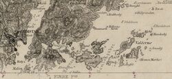 Dette kartutsnittet fra 1888 viser antydet hvor kanalen ligger, mellom Barselkilen og Osterskilen. Kartet viser også hvilket urent farvann småbåtene slapp å gå utenom. Foto: Historiske kart - www.kartverket.no