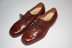 Et par herresko i størrelse 7. På læret under er det prega inn «Dacapo Prima handsydd L. Røed Halden». Foto: Digitalt Museum/Sunnfjord Museum