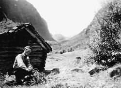 På Strandestøyl ca 1960. Han som sit og spikkar er Olav G. Holen jr. Foto: Folke Nesland