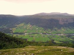 Utsyn over ein del av Skjåk hovudsokn. Grendene Skjåkstronda (med Skjåk kyrkje) og Bersustronda på hitsida (sørsida) av Ottaelva, Aura (tverrelv frå Aursjoen) og grendene Reppen og Ramstadstronda på andre sida.
