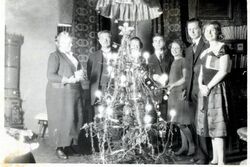 Julefeiring hos ekspedisjonssjef Fauchald. Fra venstre står fru Karen Fauchald, Kristian Adolf Fauchald, Herborg Fauchald, Bugge Asperheim, Aagot Fauchald, Fauchald (fornavn?), Kari Evang. Foto: Familiealbum