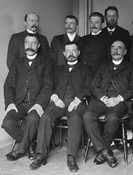 Noen av de ansatte ved Skogdirektørens kontor i 1907. Fauchald, i midten foran, var da juridisk konsulent. Foto: Ukjent (Norsk Skogmuseum) </onlyinclude>