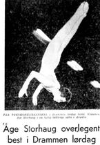 Faksimile fra Aftenposten 24. februar 1958: Utsnitt av omtale av turnstevne i Drammen der Åge Storhaug vant.