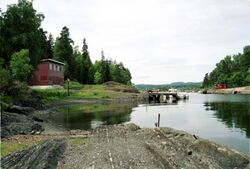 Parti fra Langårsund med brygga og den gamle butikken i bakgrunnen. Foto: Sonia Jensen (2006)