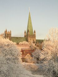 Nidarosdomen, egentlig Nidaros domkirke ( bokmål) eller Nidaros domkyrkje nynorsk, er Norges viktigste kirke. Den er i dag en luthersk domkirke og menighetskirke og betraktes både som Norges nasjonalhelligdom og som kroningskirke (selv om det ikke lenger foretas kongekroninger i Norge). I den norske Grunnloven av 1814 ble det slått fast at Kongeriket Norges regent skal krones i Trondheim. Nidarosdomen ble sist benyttet som kroningskirke i 1906, da Haakon VII ble kronet. Etter at Stortinget avskaffet kroningsseremonien, i 1908, har kirken vært brukt til signing av regenten. De norske kronregaliene har vært oppbevart i kirken. Les mer …