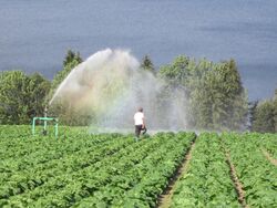 Jordbruksvatninga på Østre Toten tok så smått til i mellomkrigsåra, då grønsaksdyrkarane i Totenvika la ned vassledningar og pumpa opp vatn frå Mjøsa. På slutten av 1960-talet kom dei fyrste felles vatningsanlegga, og i 2010-åra kan om lag 40.000 dekar jordbruksareal vatnast. Dette utgjer over 1/3 av det samla jordbruksarealet i kommunen og heile 9 % av det samla vatna arealet i Norge. Åkervatninga på Toten kom med elektromotoren og vasspumper med stor kapasitet. Men behovet for vatning har vori her støtt, avhengig av jordsmonn, kva ein dyrkar og varierande nedbør frå år til år. Graset treng vatn etter fyrsteslåtten, for å få i gang att veksten så det blir god avling av håa. Potetene lyt ha vatn utpå seinsommaren, når knollane tek til å vekse. Og skal du vera sikra ei god grønsakavling, lyt det vatn til. Forsommartørken, tørkeperioden vi ofte har føre jonsok, har frå gammalt ofte vori skjebnesvanger for avlinga både av korn og av andre vekster. Les mer …