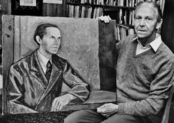Bruheim med portrett av seg sjølv, måla av Knut Ljøsne da Bruheim var lærar i Skogbygda i Vågå 1957-1958. Fotografiet er teke i 1987 i heimen til Bruheim i Lundagrenda i Skjåk.