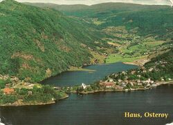 Postkort med Haus og Mjeldalen sett frå vest. Foto: Fjellanger Widerøe VisKom AS, privat eige