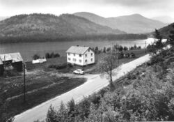 Bjones med uthus frå 1950 og våningshus frå 1954. Bilen i innkøyrsla er ein Ford Anglia av ein modell som vart produsert i åra 1959-1960. Biletet er teke av Sjur Fedje i 1966. Frå Norsk Folkemuseum.