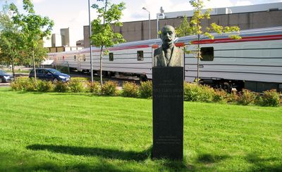 Bautaen av direktør og utenriksminister Nils Claus Ihlen. Her med det siste togsettet som forlot Bombardiers vognverksted i 2011. Foto: Steinar Bunæs.