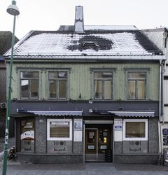 Borghild Kranes barndomshjem, Storgata 104 i Tromsø. Her drev faren baker, og hun hadde selv legekontor i andre etasje under andre verdenskrig. Foto: Stig-Lennart Sørensen (2014)