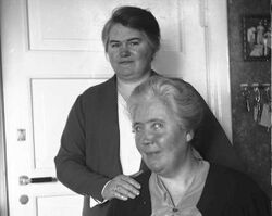 Synnøve Finden (foran) fotografert sammen med partneren Pernille Holmen i deres hjem i Arilds vei 1 på Kjelsås i Aker. Bildet er sannsynligvis tatt på 1930-tallet. Foto: Esther Langberg/Oslo Museum.