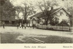 Bjerke skole. Foto: Ukjent, fra Kråkstad: En bygdebok utg. 1930. Bjerke skole i daværende Kråkstad kommune i Follo ble tatt i bruk i 1871 og var i drift i nesten hundre år. De siste elevene gikk ut skoleporten i 1968.Den første faste skolen i Kråkstad ble opprettet i 1845. Videre utover på 1800-tallet ble det opprettet flere faste skoler i kommunen. I starten holdt flere av skolene til i leide lokaler. Etter hvert ble det også reist egne skolebygg.