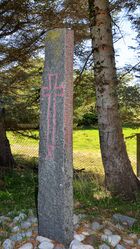 Kulisteinen. Foto: Dagfrid Boot Kulisteinen er en 1,9 meter høy, slank og firesidet runestein, med et innhugd kors på den ene bredsiden og runeinnskrift i to loddrette linjer på den ene smalsiden. Toppen av steinen mangler. Steinmaterialet er gneis.