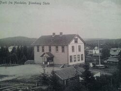 Postkort med Gamle Blomhaug skole i Hunndalen, der Hole var lærar. Familien budde òg på skulen. På biletet kan vi dessutan sjå litt av hagen han var så glad i.