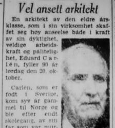 Faksimile fra Aftenposten 19. oktober 1956: Utsnitt av omtale av 90-årsdagen til Eduard Carlén .