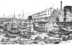Arne Kristoffersens tegning «Mitt Harstadhavn» – et minne fra hans oppvekst i dette området i 1930-årene som den gang på folkemunne gikk under navnet «Chicago».