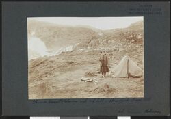 Hanna Marie Resvoll-Holmsen ved teltet sitt i Adamsfjord, Lebesby kommune. Adamsfjordfossen til venstre. Foto: Gunnar Holmsen/NB