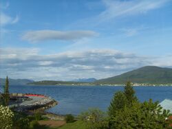Gjermundnes og Vikebukt, sett fra Vestnes, med bygda Vike, mot høyre og fjellet Vikenakken over.