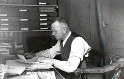 Ordfører Severin Olsen på hjemmekontoret, kammerset i Kildal. Ukjent fotograf.